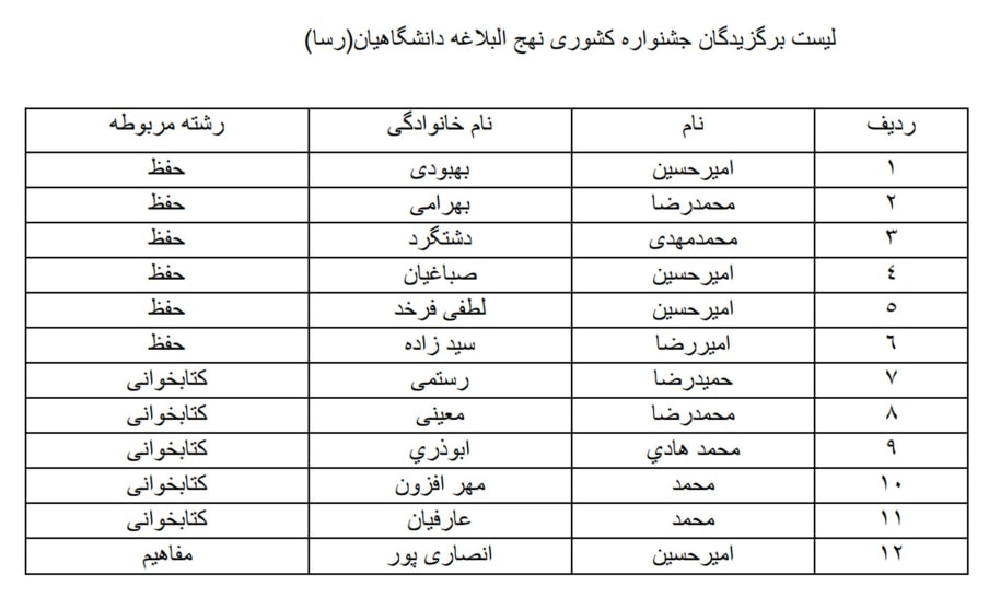 به گزارش روابط عمومی، جشنواره کشوری رسا با محوریت مفاهیم ارزشمند نهجالبلاغه، از بهمنماه 1402 تا بهمنماه 1403 برگزار شد و طی آن آثار متعددی در قالبهای مختلف ادبی، هنری، رسانهای، معارفی و پژوهشی به رقابت پرداختند.
