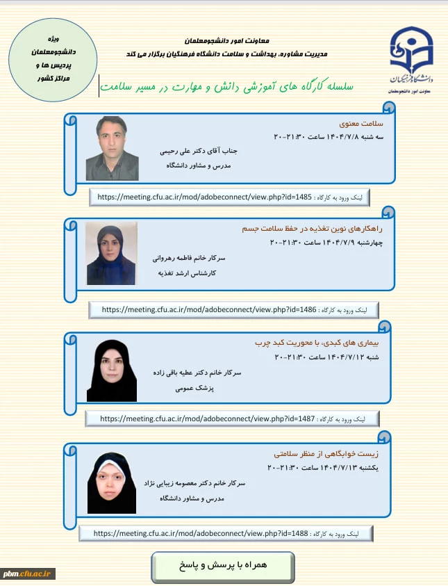 لینک ورود به کارگاه : https://meeting.cfu.ac.ir/mod/adobeconnect/view.php?id=1485