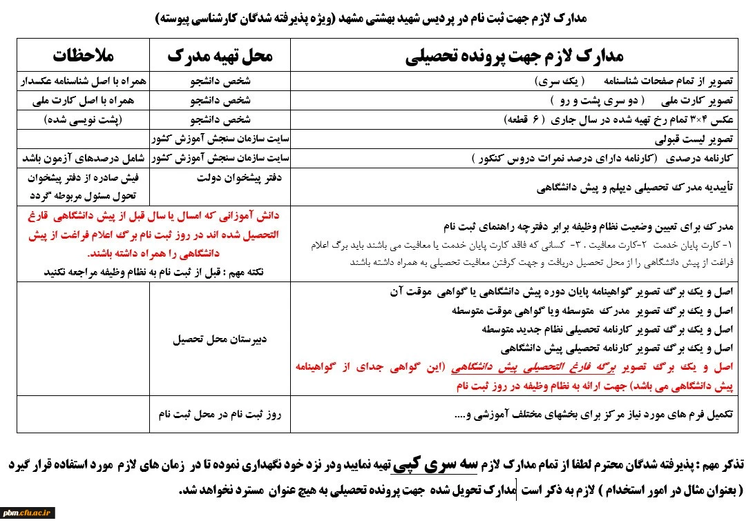 مدارک لازم جهت ثبت نام دانشجویان جدیدالورود کد 11
