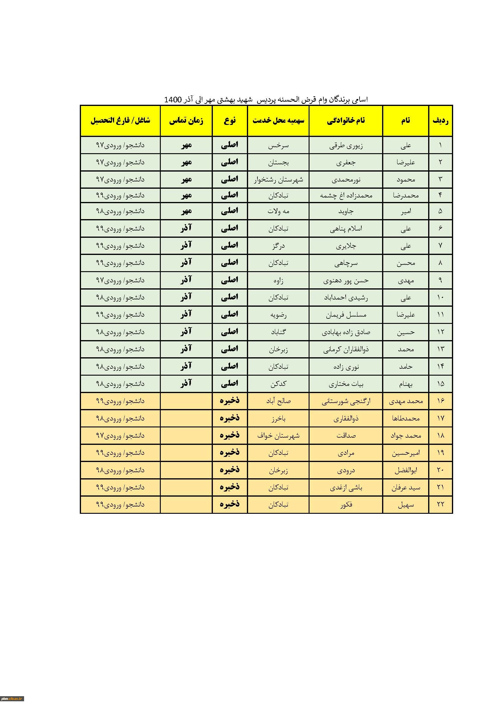 برندگان وام قرض الحسنه پردیس شهید بهشتی
