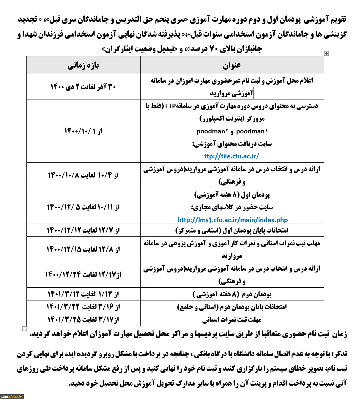 تقویم آموزشی پودمان اول و دوم دوره مهارت آموزی «سری پنجم حق التدریس و جاماندگان سری قبل»