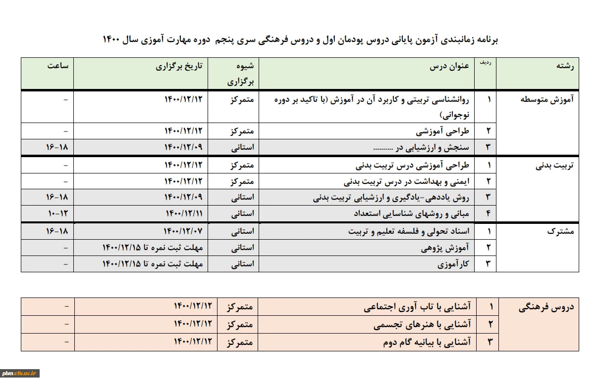 برنامه زمان بندی آزمون پایانی دروس پودمان اول و دروس فرهنگی سری پنجم دوره مهارت آموزان سال 1400