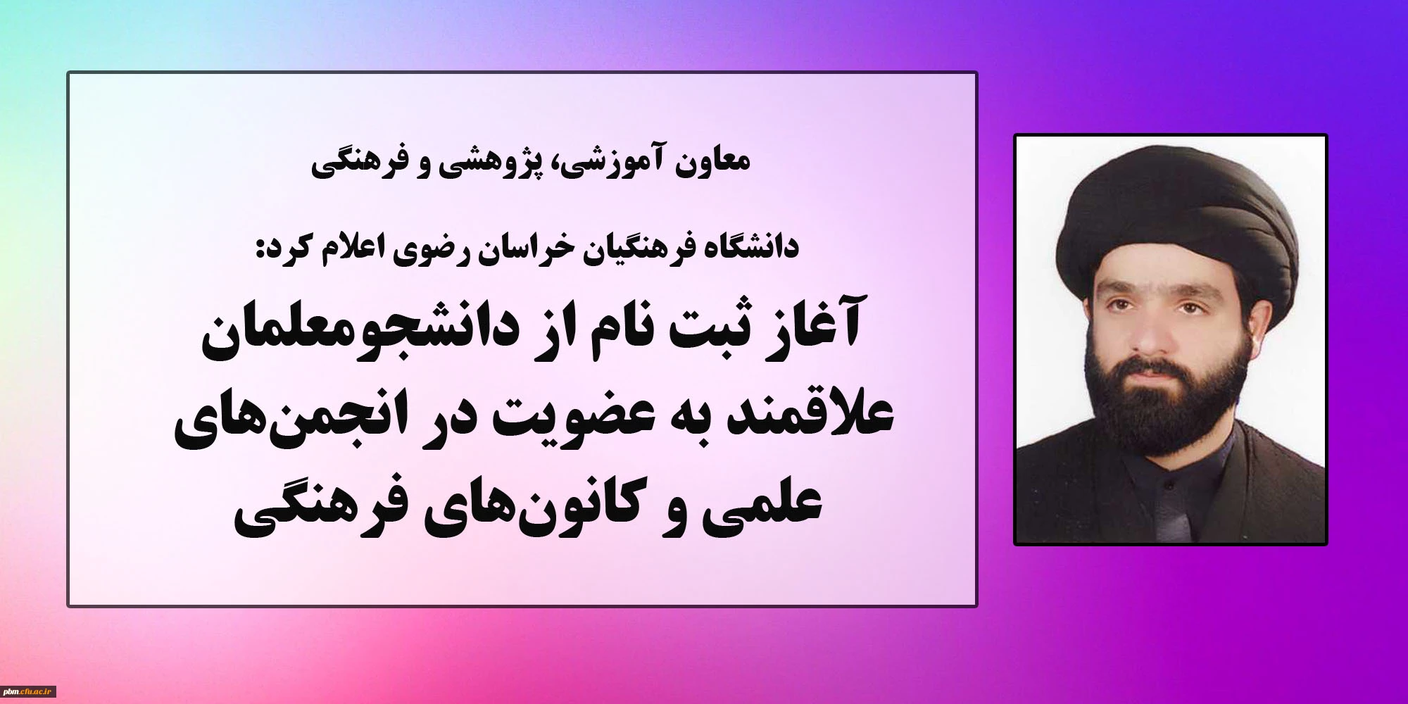 امتیاز دهید : آغاز ثبت نام از دانشجومعلمان علاقمند به عضویت در انجمن های علمی و کانون های فرهنگی یکشنبه 9 مهر 1402 ساعت 13:16