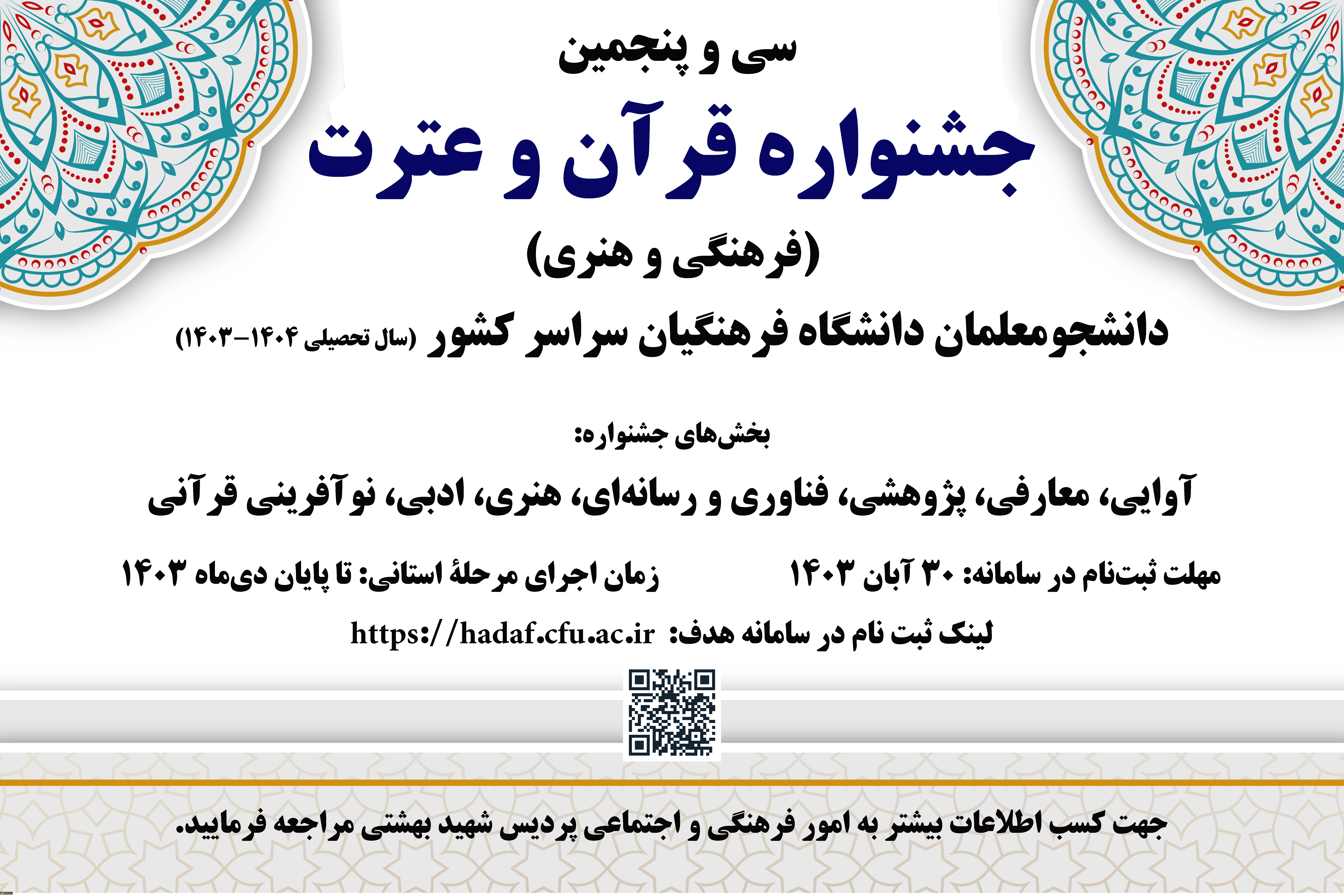 امتیاز دهید : سی و پنجمین جشنواره قرآن و عترت (فرهنگی و هنری) دانشجومعلمان یکشنبه 20 آبان 1403 ساعت 12:11